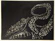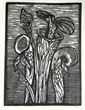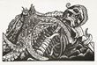 printmaking, woodcut, relief printing, embroidery, textile, fiber, octopus, skull, plants, sea life